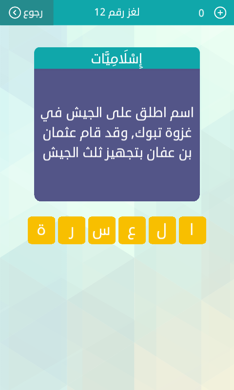 حل اسم اطلق على الجيش فى غزوة تبوك وقد قام عثمان بن عفان بتجهيز ثلث الجيشمن لغز رقم 96 للمجموعة 1 صقور الإبدآع