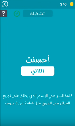 اجابة هى الاسم الذى يطلق على توزيع المراكز فى الفريق مثل 2 4 4 من 6 حروف من لعبة كلمة السر 2