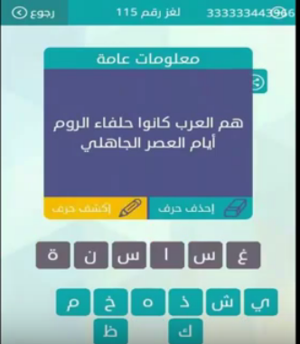 اجابة لغز هم العرب كانوا حلفاء الروم ايام العصر الجاهلى رقم 115 من لعبة وصلة للمجموعة الثالثة صقور الإبدآع