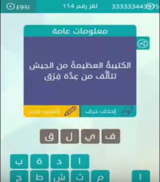 الكتيبه العظيمه من الجيش تتالف من عدة فرق. ما اسم الكتيبة العظيمة من الجيش تتكون من عدة فرق الحل الاجابة. حل سؤال الكتيبة العظيمة من الجيش تتالف من عدة فرق لغز رقم 114 من لعبة وصلة فى المجموعة الثالثة عشر مرحباااا زائرينا الكرام نحن مستمرون معكم و اقدم لكم لعبة وصلة وفيها حل لكل لغز اتمنى ان تنال رضاكم سؤال اللغز معلومات. فرق من 4 حروف يكون جواب السؤال هو فيلق. حلول الغاز لعبة وصلة المجموعة السادسة اللغز رقم 54.
