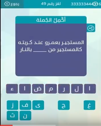 اجابة سؤال المستجير بعمرو عند كربته كالمستجير من بالنار لغز رقم 49 من لعبة وصلة فى المجموع صقور الإبدآع
