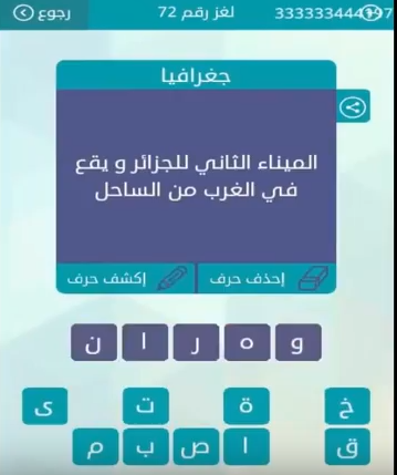 جواب سؤال الميناء الثانى للجزائر يقع فى الغرب من الساحل من لعبة وصلة المجموعة الثامنة لغز رقم 72 صقور الإبدآع