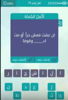 حل سؤال ان عشت فعش حرا او مت ك وقوفا لغز رقم 79 من المجموعة التاسعة من لعبة وصلة صقور الإبدآع