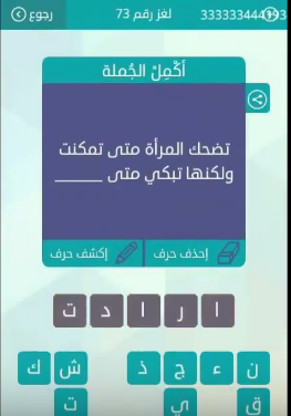 اجابة سؤال تضحك المراة متى تمكنت ولكنها تبكى متى لغز رقم 73 من لعبة وصلة فى المجموعة التاسع صقور الإبدآع