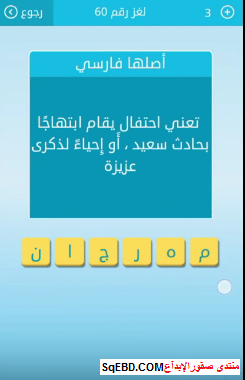حل سؤال تعنى احتفال يقام ابتهاجا بحادث سعيد او احياء لذكرى عزيزة لغز رقم 60 للمجموعة السابعة من ل صقور الإبدآع
