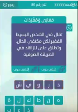اجابة تقال فى الشخص البسيط الفقير لكن مكتفى الحال وتطلق على للزاهد فى الطريقة الصوفية لغز رقم 80 صقور الإبدآع