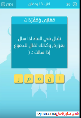 اجابة سؤال تقال في الماء اذا سال بغزارة وكذالك تقال للدموع اذا سالت من لغز 13 رمضان من لعبة رشف صقور الإبدآع