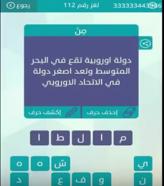 اجابة دولة اوروبية تقع فى البحر المتوسط وتعد اصغر دولة فى الاتحاد الاوروبى لغز رقم 112 من لعبة و صقور الإبدآع