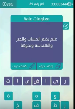 حل لغز علم يضم الحساب والجبر والهندسة ونحوها رقم 89 من لعبة وصلة للمجموعة العاشرة صقور الإبدآع