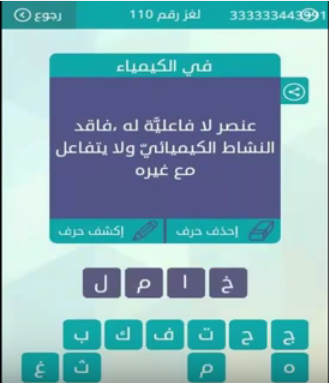 اجابة عنصر لا فاعلية له فاقد النشاط الكيميائى ولا يتفاعل مع غير لغز رقم 110 من لعبة وصلة فى ال صقور الإبدآع