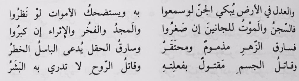 والعدل في الأرض يبكي الجن لو سمعوا به و يستضحك الأموات لو نظروا فالسجن والموت للجانين إن صغروا والمجد والفخر والإثراء إن كبروا فسارق الزهر مذموم ومحتقر وسارق الحقل يدعى الباسل الخطر