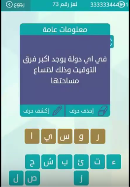 اجابة لغز فى اى دولة يوجد اكبر فرق التوقيت وذلك لاتساع مساحتها لغز رقم 73 من لعبة وصلة فى المجموعة صقور الإبدآع
