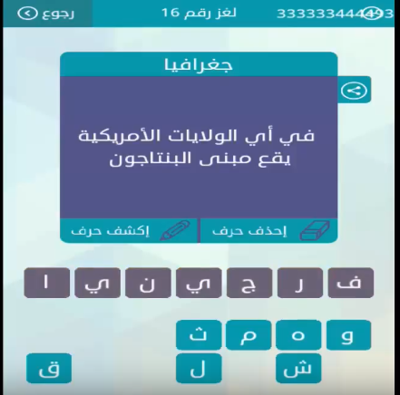 جواب سؤال فى اى الولايات الامريكية يقع مبنى البنتاجون لغز رقم 16 من لعبة وصلة للمجموعة الثانية صقور الإبدآع