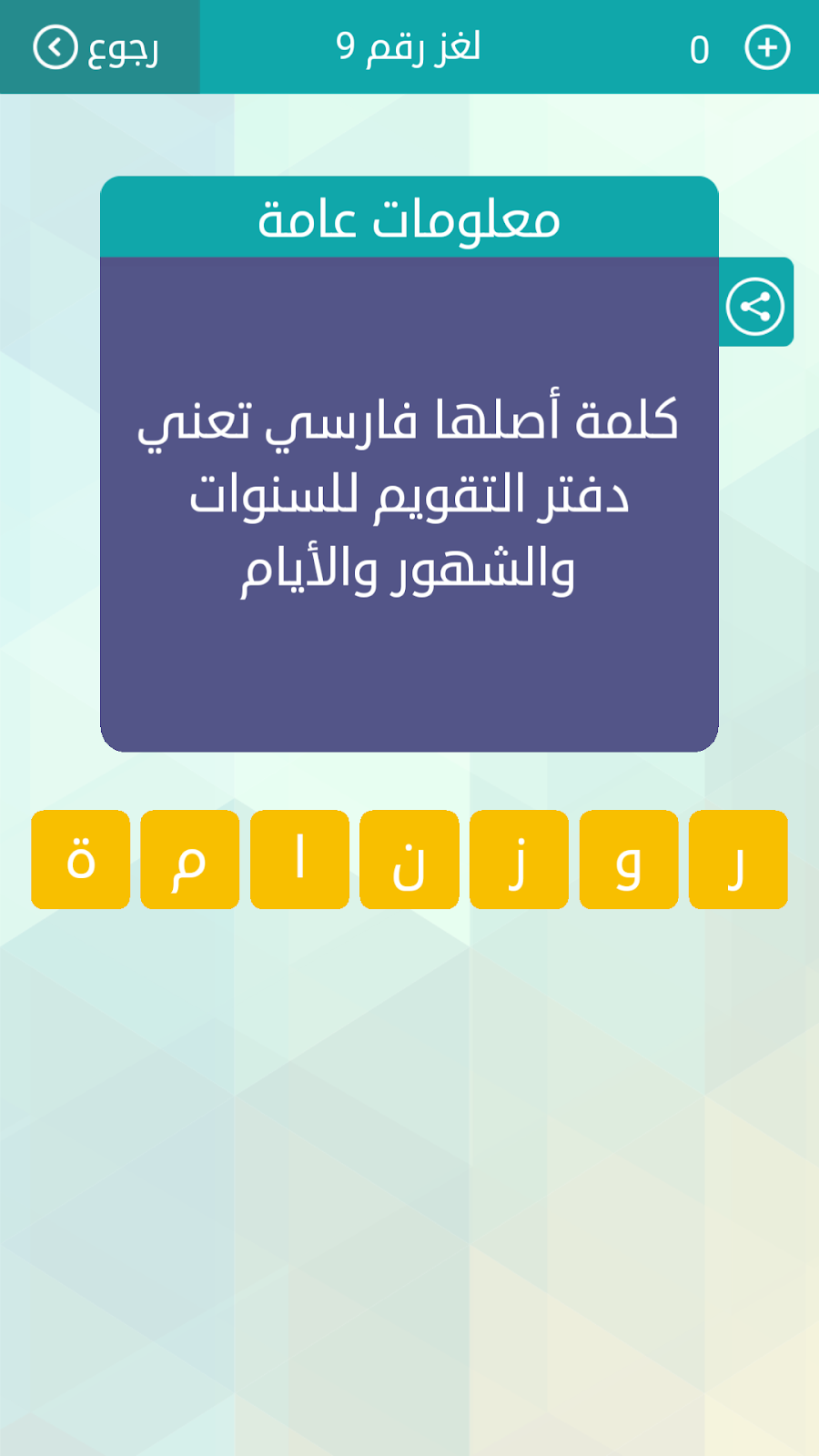 حل معلومات عامة كلمة اصلها فارسي تعني دفتر التقويم للسنوات والشهور والايام لغز رقم 9 من لعبة وص صقور الإبدآع