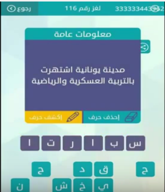 اجابة لغز مدينة يونانية اشتهرت بالتربية العسكرية والرياضية رقم 116 من لعبة وصلة للمجموعة الثال صقور الإبدآع