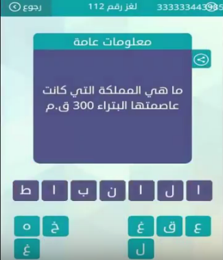 اجابة لغز ماهى المملكة التى كانت عاصمتها البتراء 300 ق م لغز رقم 112 من لعبة وصلة فى المجموعة ال صقور الإبدآع