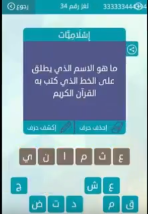 جواب ماهو الاسم الذى يطلق على الخط الذى تب به القرآن الكريم لغز رقم 34 من لعبة وصلة للمجموعة الرا صقور الإبدآع