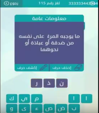 حل سؤال ما يوجبه المرء على نفسه من صدقة او عبادة او نحوهما رقم 115 من لعبة وصلة للمجموعة الثالثة صقور الإبدآع