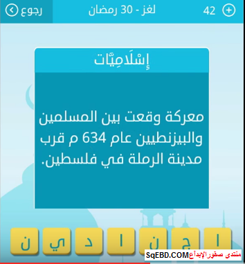 جواب سؤال معركة وقعت بين الملسمين والبزنطيين عام 634م قرب مدينة الرملة في فلسطين 30 رمضان من لعبة صقور الإبدآع