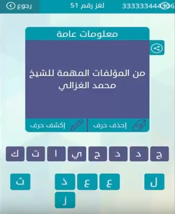 اجابة من المؤلفات المهمة للشيخ محمد الغزالى لغز رقم 51 من لعبة وصلة فى المجموعة السادسة صقور الإبدآع