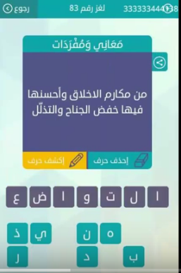 من مكارم الاخلاق واحسنها فيها فيها خفض الجناح والتذلل س ئل سبتمبر 16 2015 بواسطة لى لى 1 إجابة 3 9k مشاهدة. حل لغز من مكارم الاخلاق واحسنها فيها خفض الجناح والتذلل معاني ومفردات modesty لعبة وصلة كلمات متقاطعة لغز 114 هنا فقط المصدر الموثوق للمعلومة الصحيحةن اجابة لاي سؤال. خفض الجناح والتذلل وصلة الاجابة هي التواضع. من مكارم الاخلاق واحسنها فيها فيها خفض الجناح والتذلل.