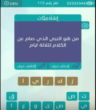 اجابة سؤال من هو النبى الذى صام عن الكلام لثلاثة ايام رقم 113 من لعبة وصلة للمجموعة الثالثة عشرة صقور الإبدآع