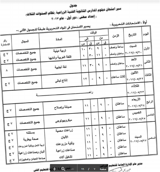 جدول امتحانات الثانوية الزراعية آخر العام 2017