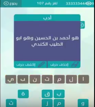 اجابة سؤال هو احمد بن الحسين وهو ابو الطيب الكندى لغز رقم 107 من لعبة وصلة فى المجموعة الثانية ع صقور الإبدآع
