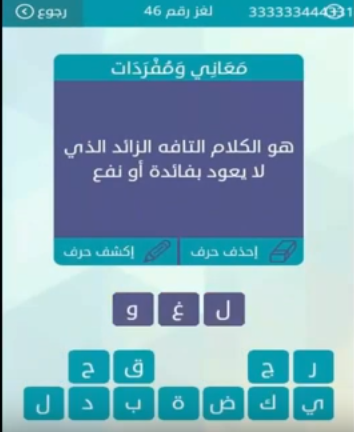 حل سؤال هو الكلام التافه الزائد الذى لا يعود بفائدة او نفع لغز رقم 46 من لعبة وصلة فى المجموعة ا صقور الإبدآع