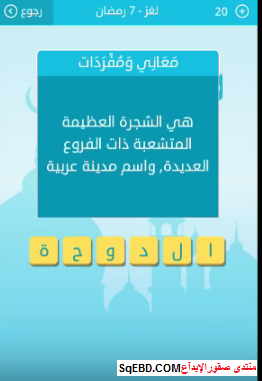 اجابة لغز هي الشجرة العظيمة المتشعبة ذات الفروع العديدة واسم مدينة عربيةمن لغز 7 رمضان من لعبة رشف صقور الإبدآع