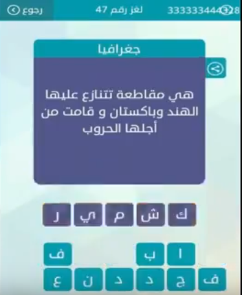 حل هى مقاطعة تتنازع عليها الهند وباكستان وقامت من اجلها الحروب لغز رقم 47 من لعبة وصلة فى المجمو صقور الإبدآع