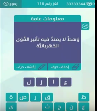 جواب سؤال وسط لا يمتد فيه تاثير القوى الكهربائية رقم 116 من لعبة وصلة للمجموعة الثالثة عشرة صقور الإبدآع